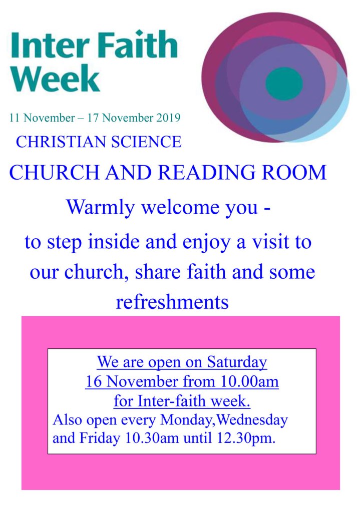 October 30, 2019November 16, 2019slifkendal image Christian Science Church Inter Faith Week Share this: Click to share on X (Opens in new window) X Click to share on Facebook (Opens in new window) Facebook Like Loading...